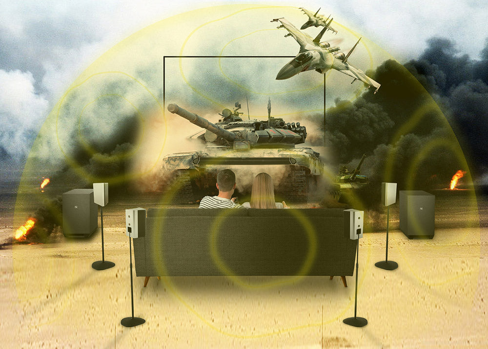 Los controladores de doble cono de rango extendido, los tweeters de efectos envolventes de cúpula de seda y los amplificadores de alto rendimiento ofrecen diálogos nítidos, agudos más limpios y efectos envolventes más fuertes y realistas.