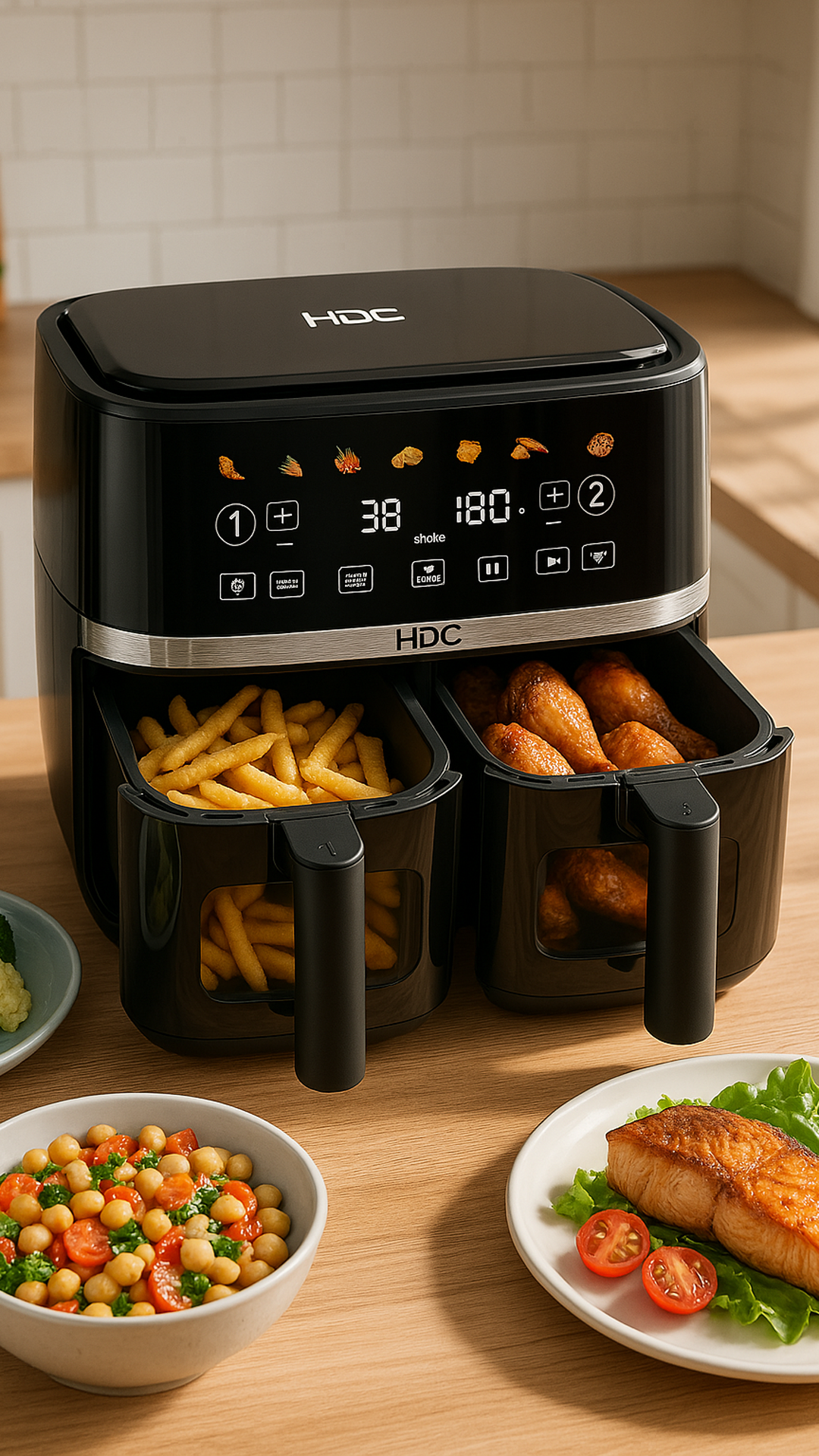 La freidora de aire HDC HAF-SH100DB redefine la experiencia de cocinar con aire caliente gracias a su diseño innovador y su doble funcionalidad. Con una gran capacidad total de 10 litros, dividida en dos canastas independientes de 5 litros cada una, esta freidora permite preparar distintas recetas al mismo tiempo, optimizando el tiempo y ampliando las posibilidades en la cocina.