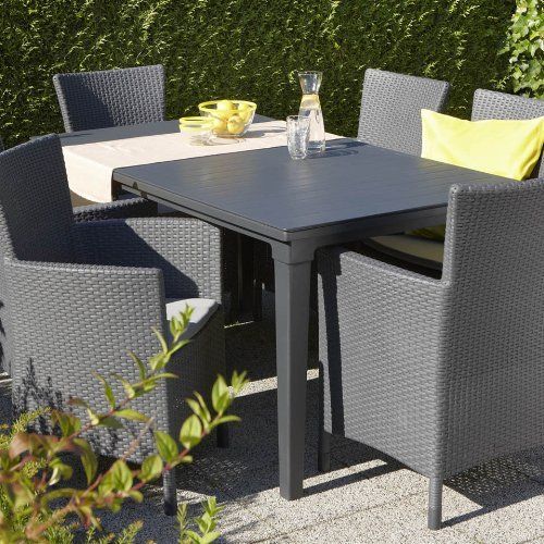 MESA DE JARDÍN ALLIBERT FUTURA – GRAFITO El diseño elegante y esbelto de la mesa de jardín Futura es una ventaja para todos los que les gusta cenar al aire libre. Hay espacio suficiente para cuatro o seis personas. El tablero de la mesa tiene un acabado con aspecto de madera, pero es fácil de mantener. No es necesario utilizar aceite ni pintura.