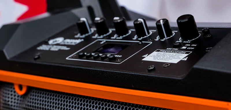 En uno de sus laterales este parlante semi-profesional contiene los botones de encendido y apagado y las entradas auxiliar y de micrófono 6.5mm. Incluye micrófono cableado con el que no vas a poder parar de cantar. Sobre la parte superior, junto a su aza de agarre, se encuentran las perillas para controlar al 100% las posibilidades de tu parlante. Mediante su configuración de dos vías asegurada por su woofer de 10¨y su tweeter de 25mm, se da la mayor apreciación posible de los sonidos graves y agudos, respectivamente.