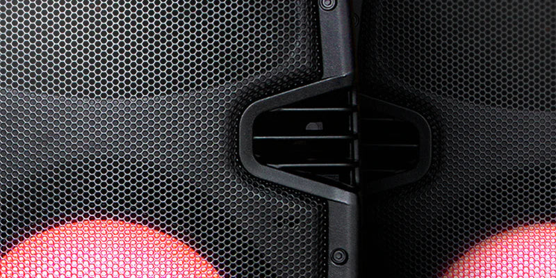 Todos los controles del parlante están ubicados en la parte posterior en donde se pueden encontrar sus perillas junto con las entradas y pantalla LED del reproductor mp3. Con efectos de luces incorporados que lo vuelven agradable visualmente, este parlante proporciona una rica experiencia con el sonido ya que su potencia alcanza 1600W (80W RMS) y su placa amplificadora es de clase AB, lo que le otorga una muy elevada calidad de sonido.