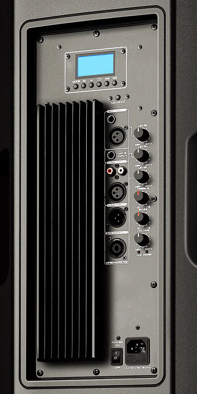 Todas sus funciones y posibilidades de uso son manejables desde el panel de control ubicado en su parte posterior, que expone las entradas, las perillas y la pantalla LED donde se muestran los valores elegidos. Extremadamente poderoso, hace vibrar hasta los huecos más recónditos, ya que su potencia sonora ultra rendidora es de 4000W PMPO (300W RMS). La formidable placa amplificadora de clase AB que lo compone acompaña esta característica aportándole sublime calidad de audio. Su configuración de dos vías es posibilitada por su doble woofer de 15¨ y tweeter de 1¨ que viabilizan al máximo los sonidos graves y agudos, respectivamente.