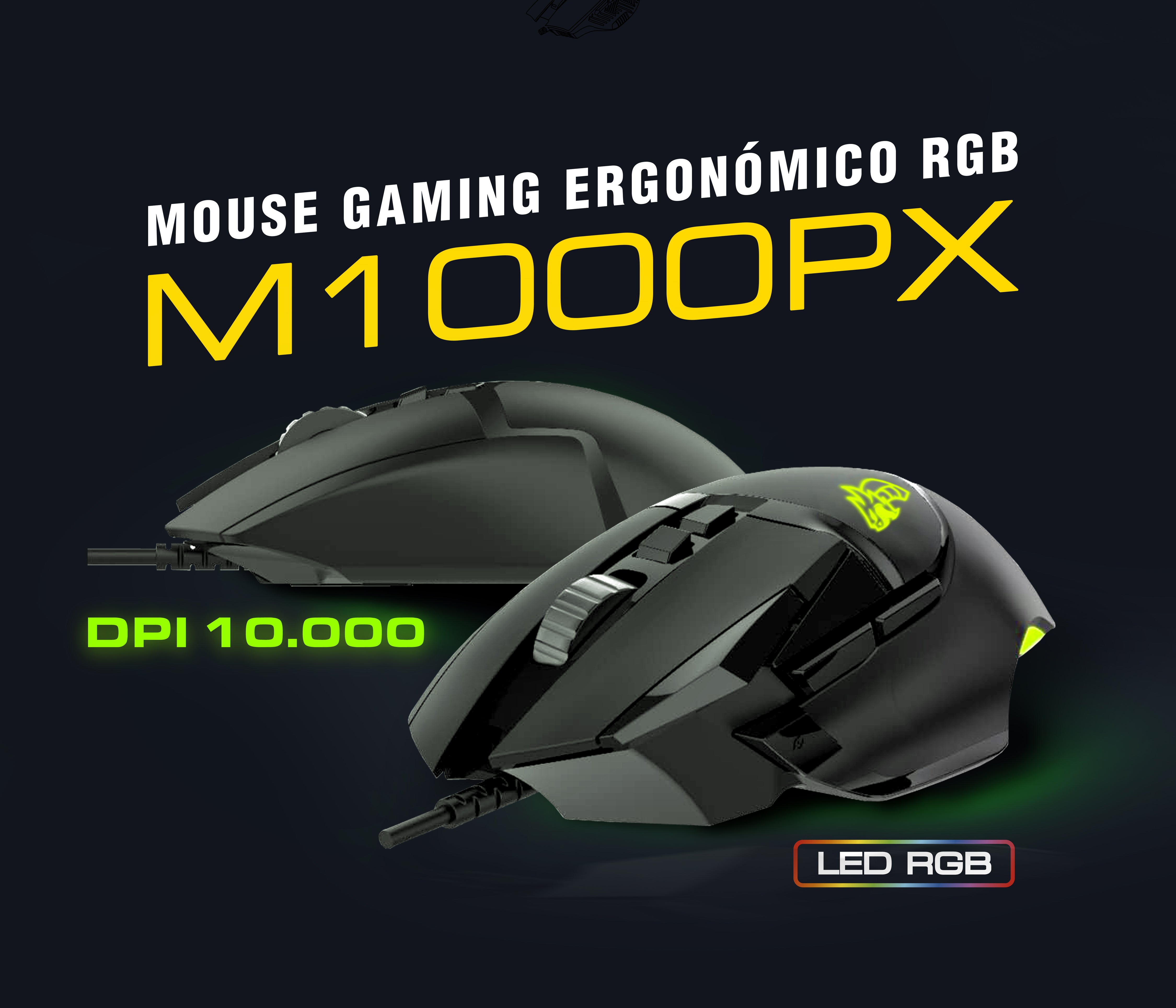 El M1000px es un mouse gaming de alto rendimiento con 10 botones personalizables a través de software que te proporcionará una experiencia de juego más inmersiva. Cuenta con un sensor óptico Pixart3325 IC, proporcionando una precisión de hasta 10000 dpi regulables y una vida útil de los interruptores de 20 millones de clicks, perfecto para largas sesiones de juego.