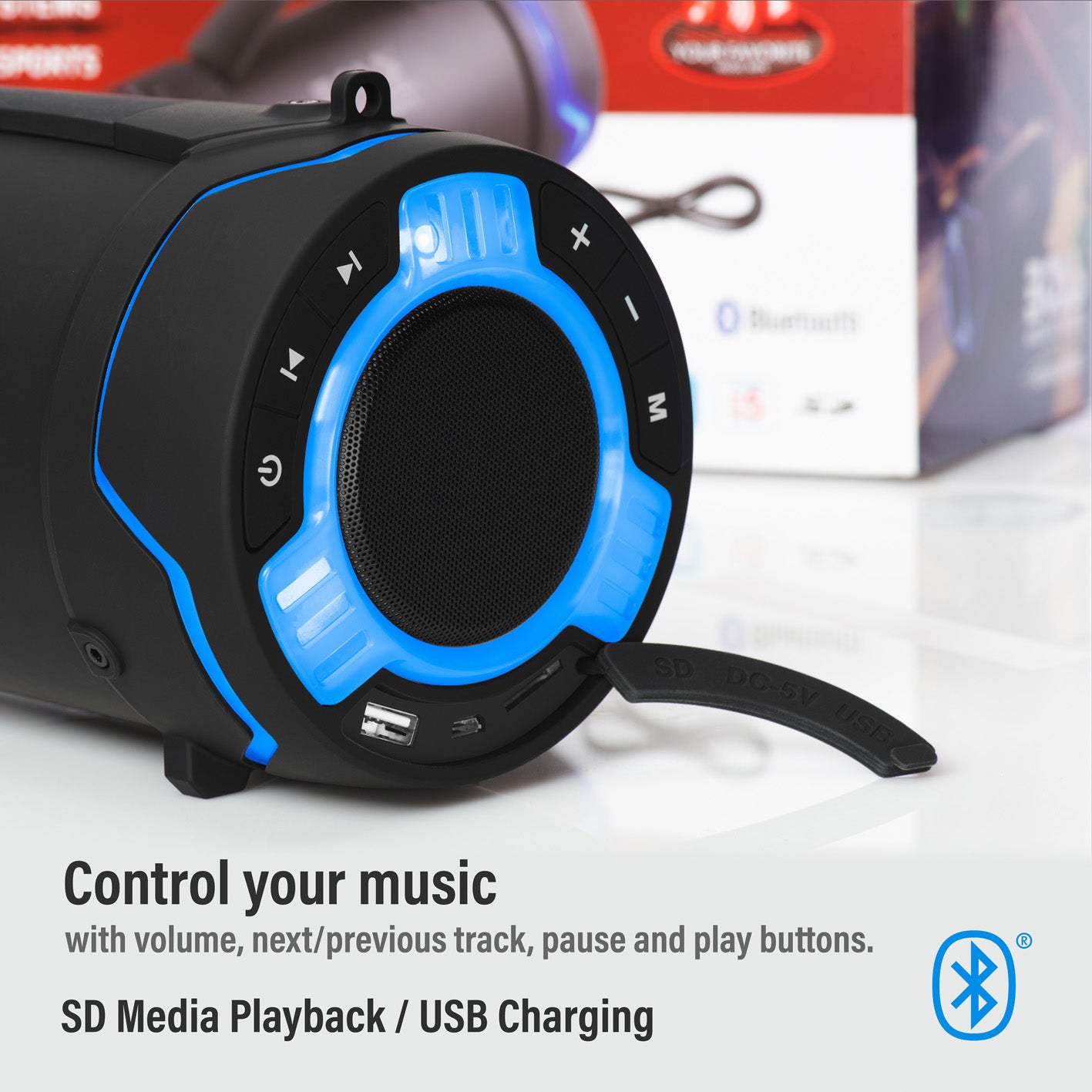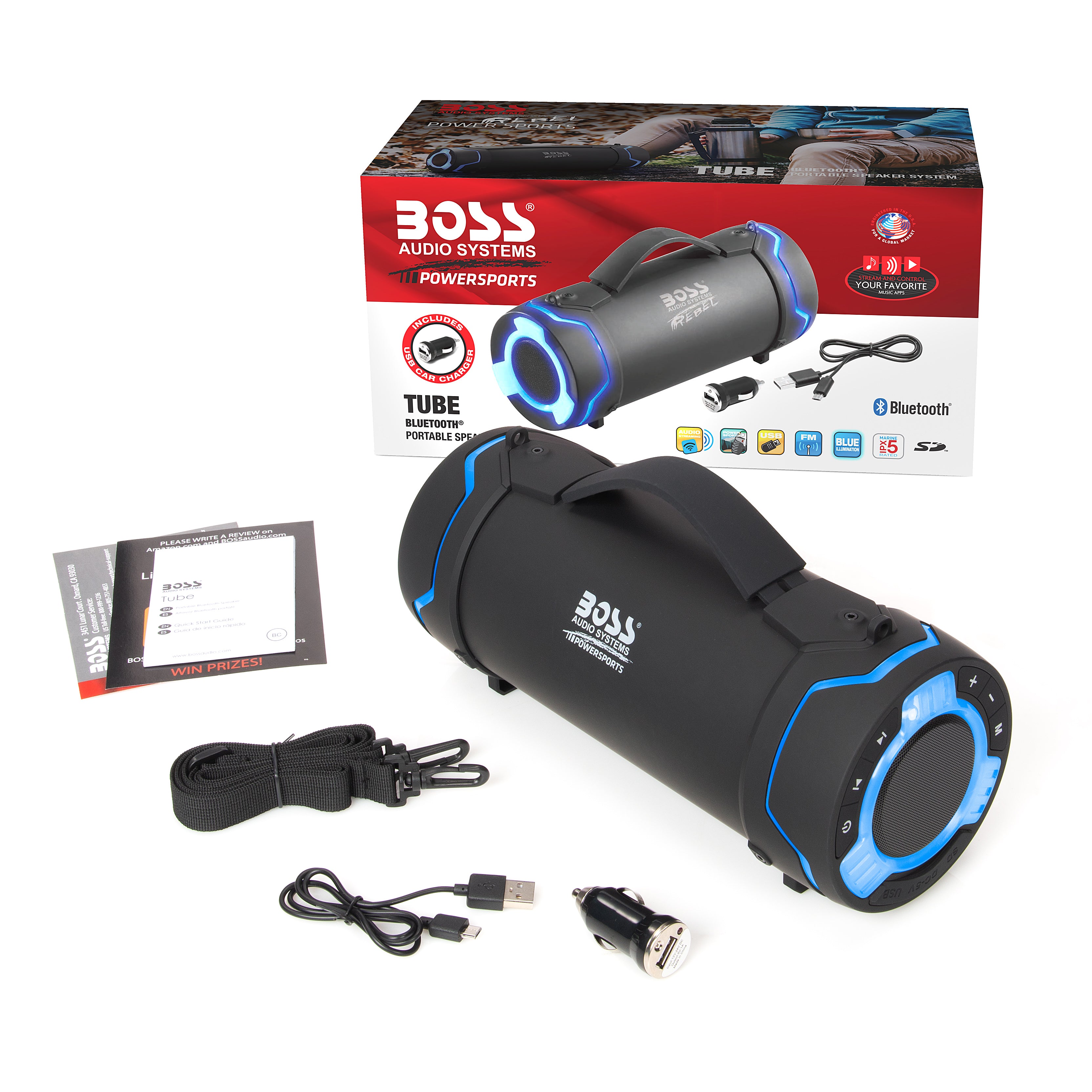 Con el altavoz BOSS Audio TUBE Bluetooth, todo el mundo puede compartir sus archivos de música favoritos con el sencillo emparejamiento o conectarse a aplicaciones de música. El tube es resistente a la intemperie, en caso de que choques con una lluvia inesperada o quieres salir al aire libre ya que junto a la iluminación azul pudes hacer de cualquier lugar una fiesta y elevar la barra de entretenimiento. Escucha y responde a llamadas a través de los altavoces y el micrófono