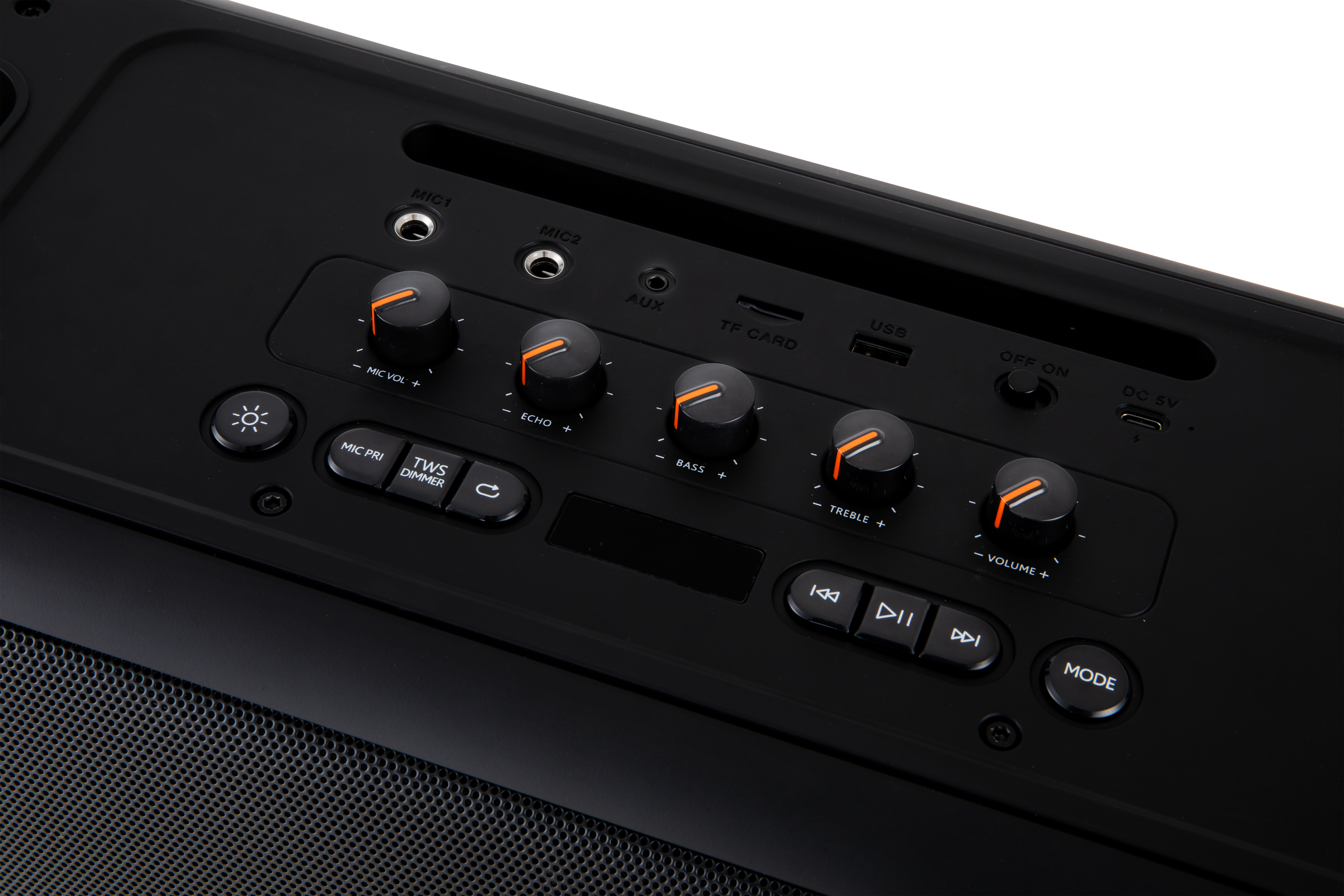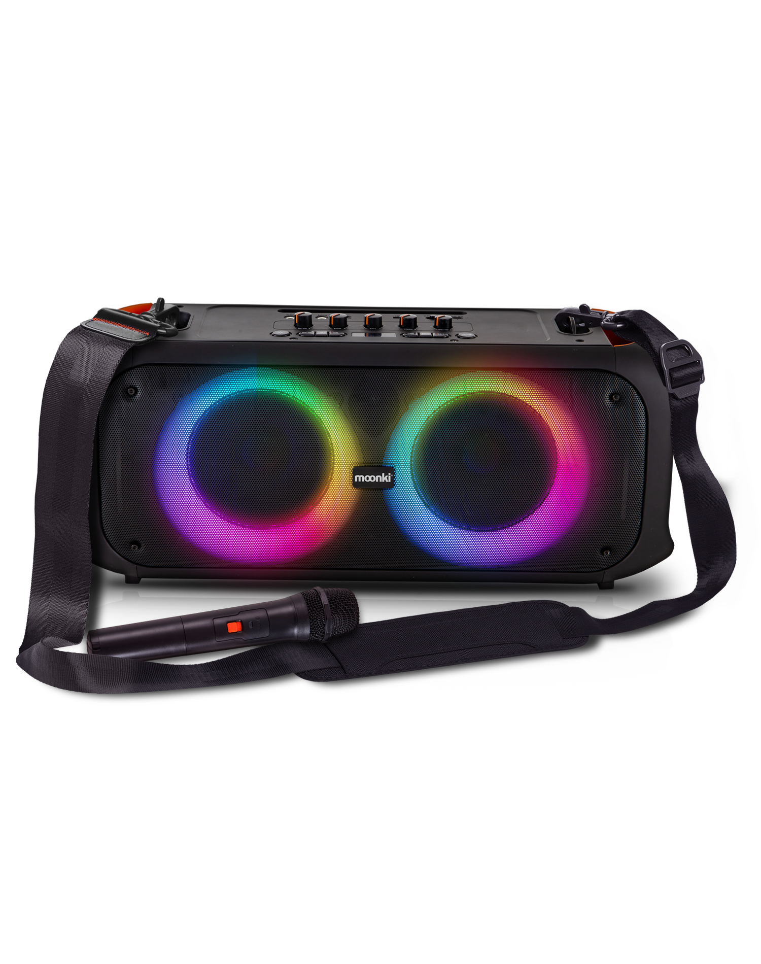 Con woofer con iluminación LED que combina estilo y funcionalidad. Su diseño minimalista se adapta a cualquier ambiente, mientras que el micrófono inalámbrico y la correa de transporte te permiten llevar la fiesta a donde quieras.
