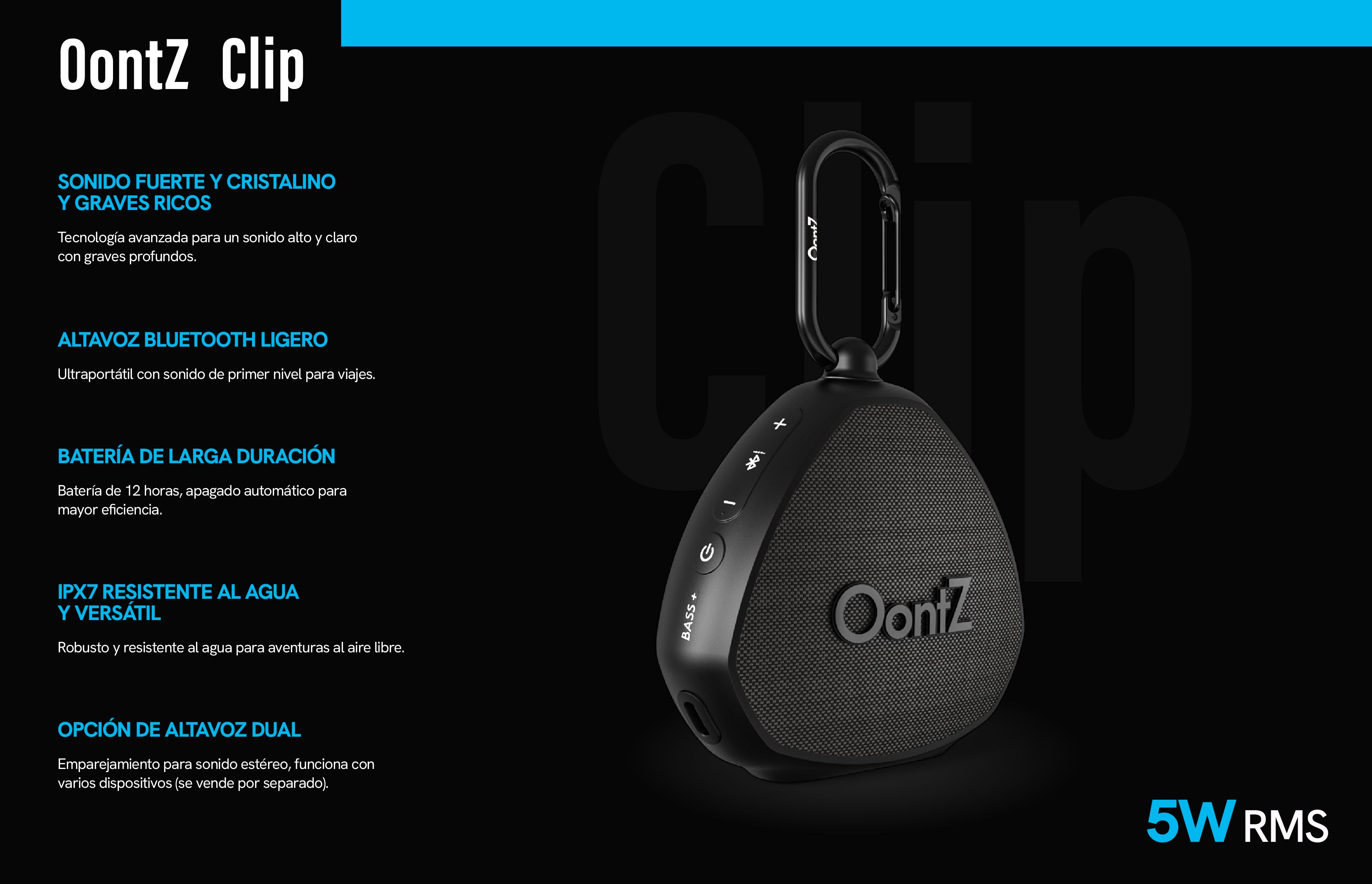 Ligero, duradero y fácil de usar, el OontZ Clip ofrece la combinación perfecta de portabilidad, resistencia y excelente calidad de sonido en un solo dispositivo compacto.