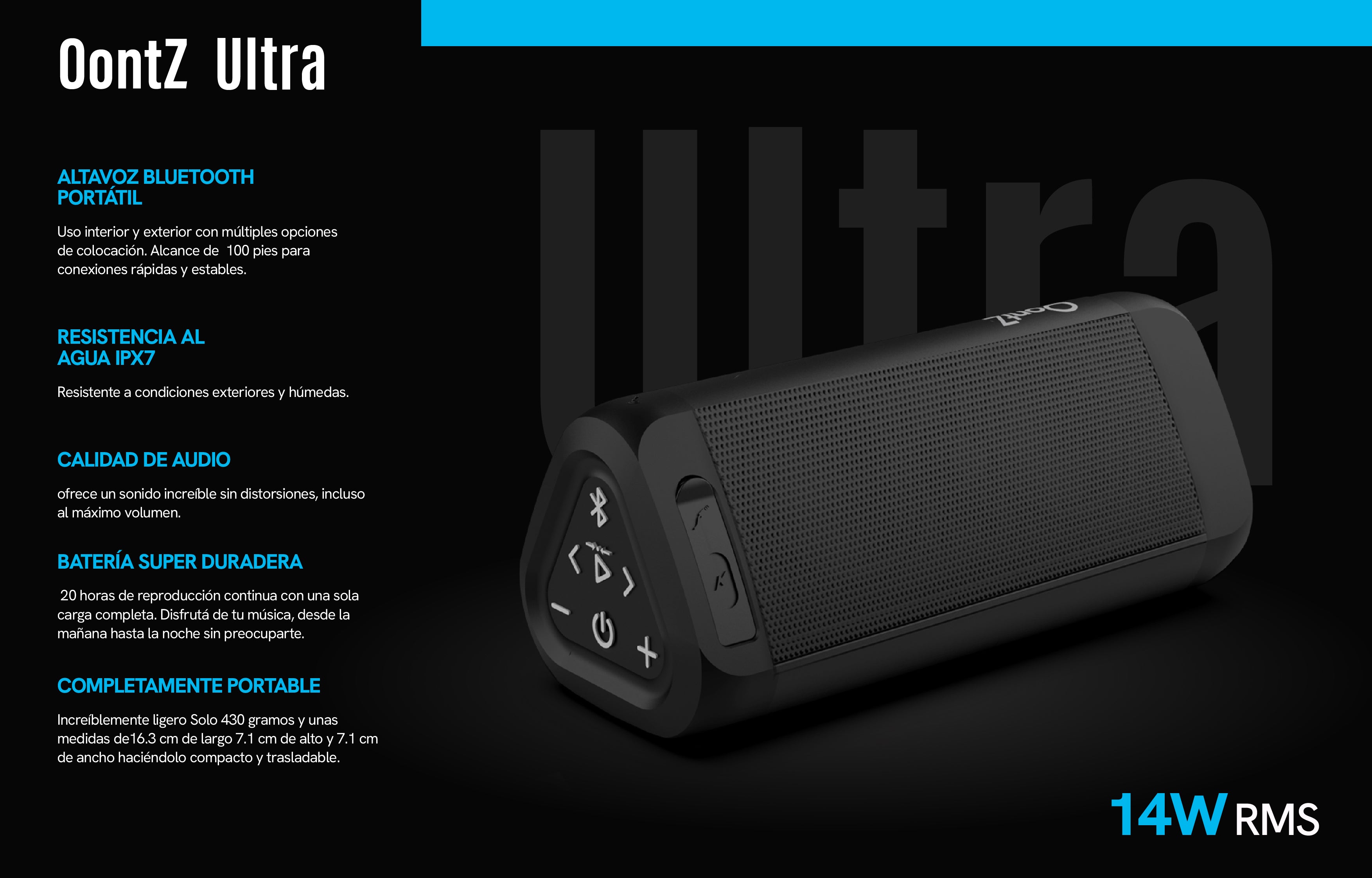 Gracias a su potente amplificador de volumen de 14 watts, el parlante Bluetooth OontZ Ultra ofrece un sonido increíble sin distorsiones, incluso al máximo volumen. Disfrutá tu música como debe escucharse, el OontZ Ultra es el parlante inalámbrico ideal para cualquier espacio.