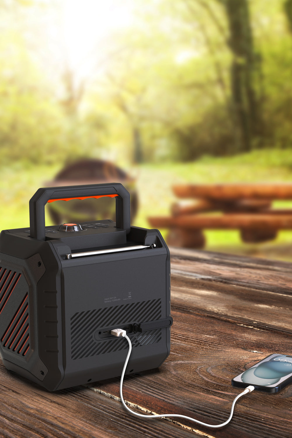 Diseñada para resistir los desafíos del día a día, cuenta con una construcción robusta que reduce el daño ante golpes y ofrece resistencia IPX5 contra salpicaduras. Su doble batería de 3.7V / 2000mAh proporciona hasta 15 horas de reproducción continua y permite cargar otros dispositivos gracias a su función Power Bank (5V/1.5A).