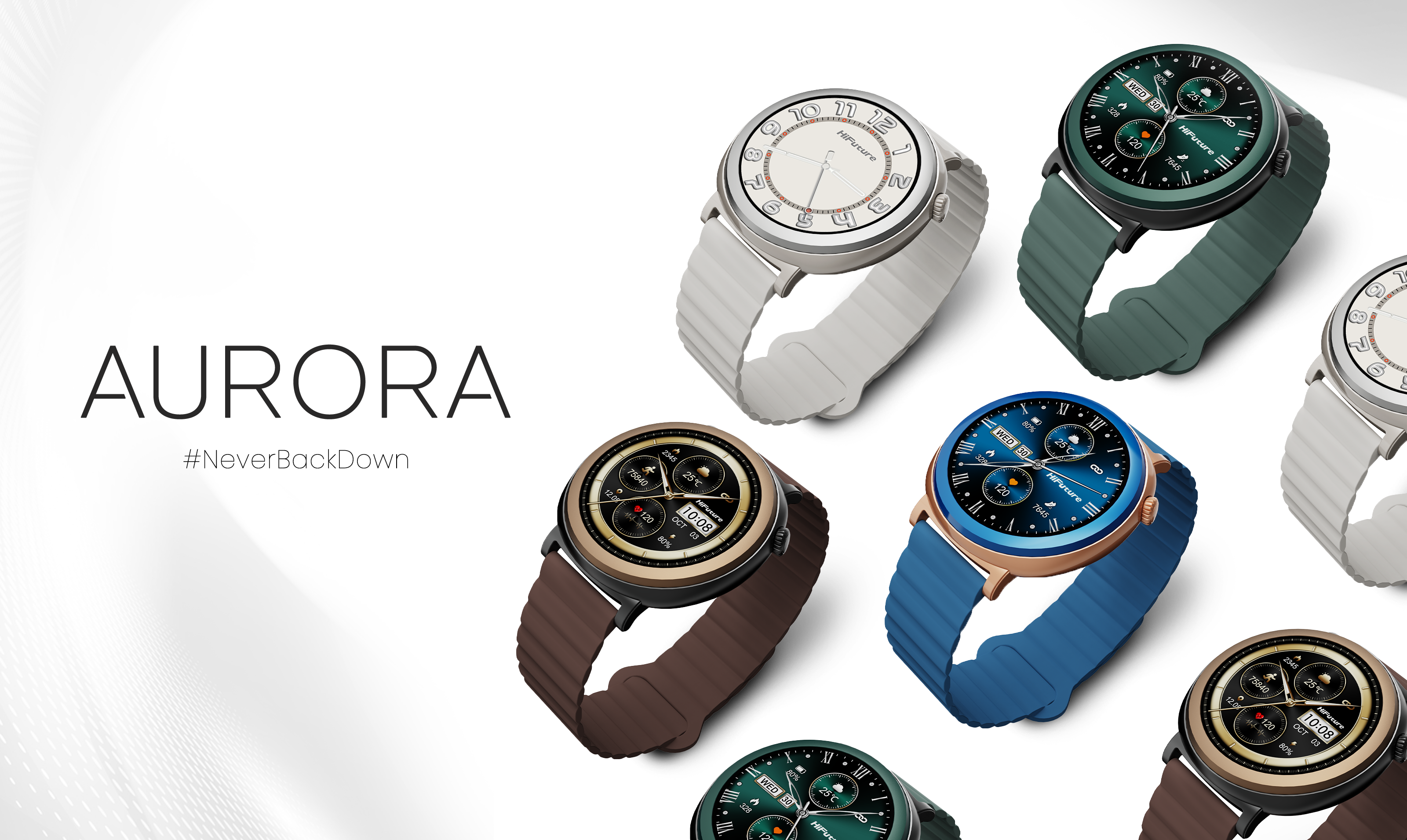 Expresá tu personalidad con el AURORA smartwatch, disponible en una variedad de colores que reflejan tu estado de ánimo. Ya sea el clásico marrón, el audaz verde oscuro, el moderno azul o el versátil gris claro, hay un tono ideal para cada ocasión.