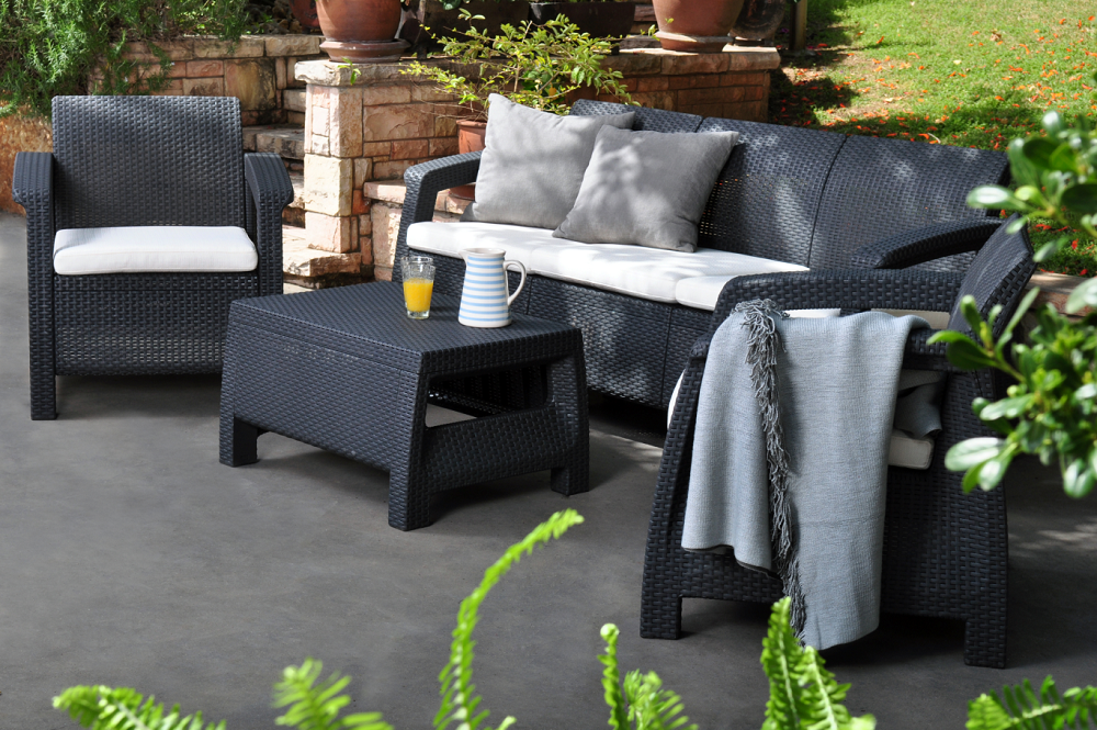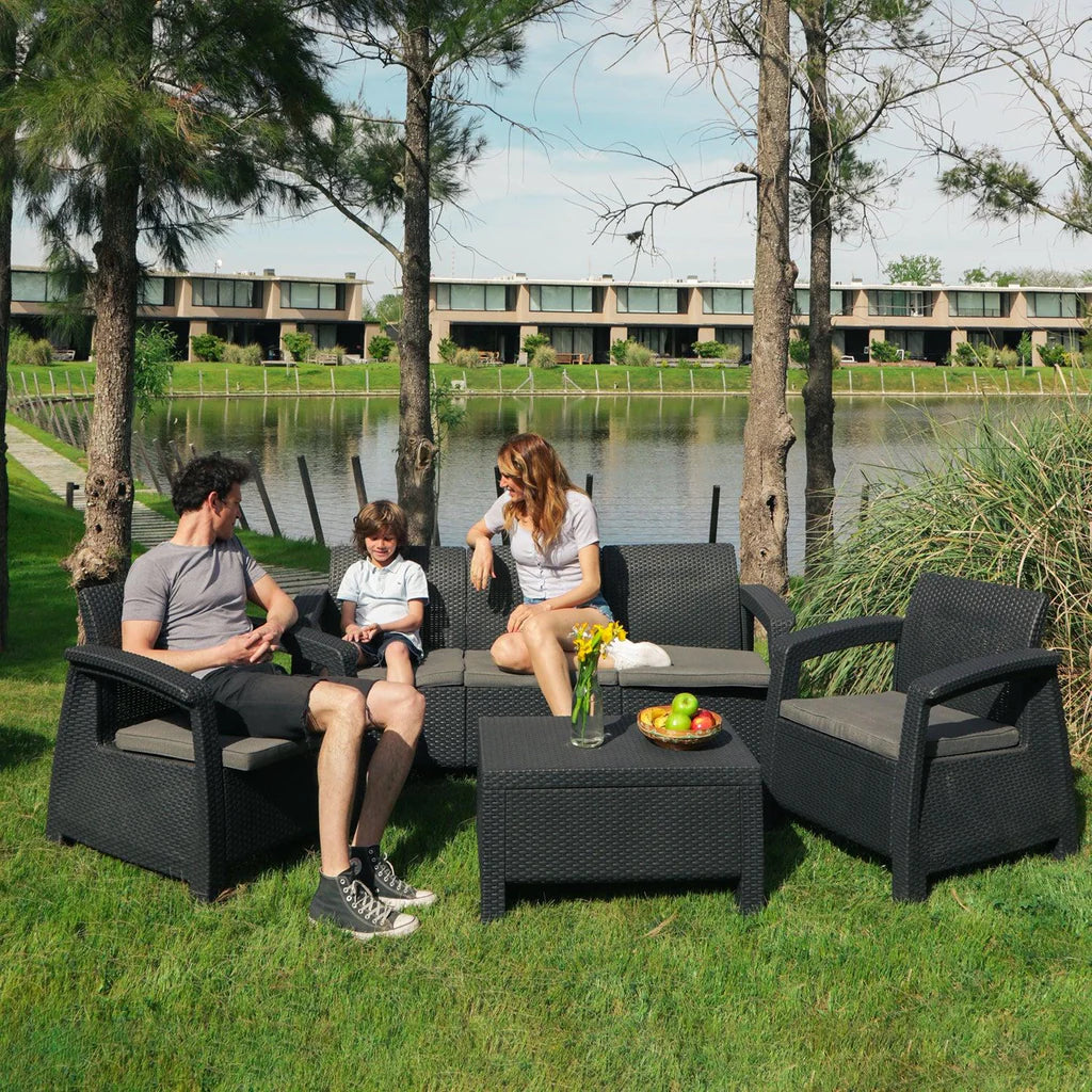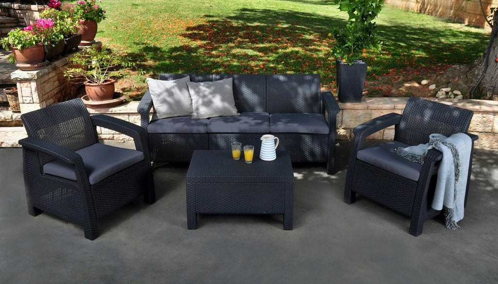 El conjunto triple de Corfú es nuestro conjunto de área de asientos al aire libre más grande, con capacidad para cinco adultos. Este conjunto presenta un sofá de tres asientos de diseño ergonómico, dos sillones de diseño ergonómico y una mesa decorativa de buen tamaño, todo terminado con una textura tejida de ratán que te encantará ver en tu patio.