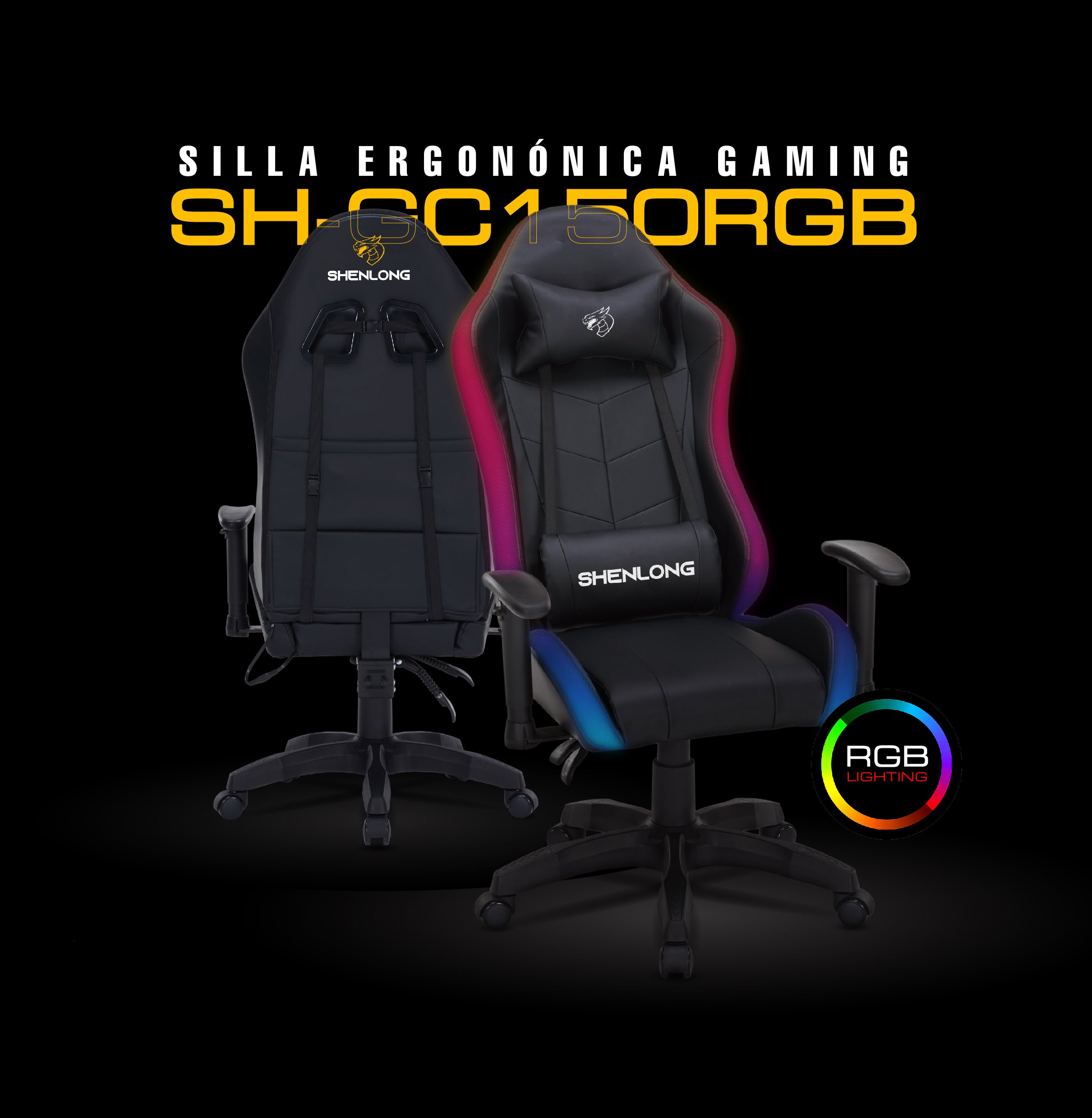 La Shenlong SH-GC150RGB es una silla gamer diseñada para ofrecer una experiencia cómoda y ajustable, ideal tanto para sesiones de juego como de trabajo. Su estructura combina metal y madera para mayor resistencia, recubierta con polipropileno duradero y acolchada con dos tipos de espuma que brindan un confort superior.