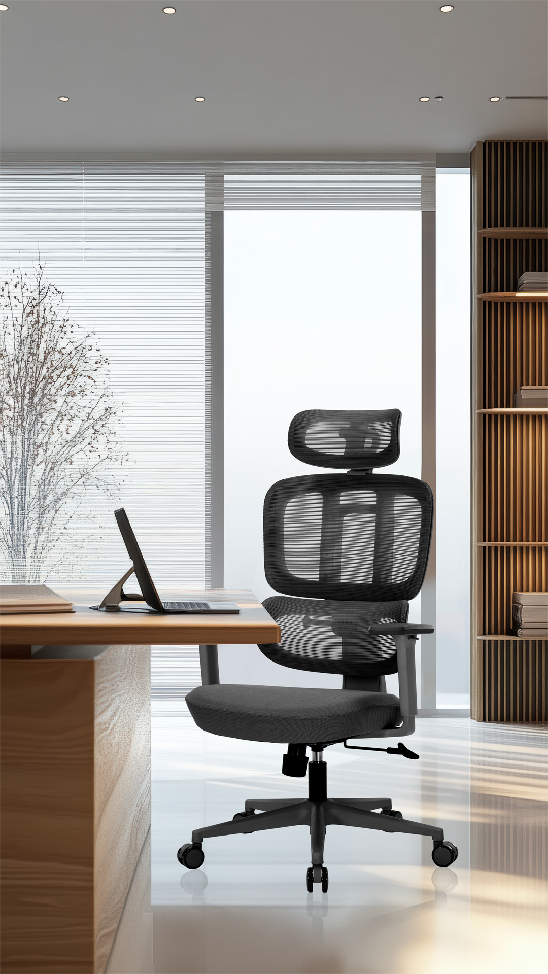 Además, incorpora un práctico apoyacabeza para mayor confort cervical, un sistema de elevación de gas Clase 3 para ajustes suaves y duraderos, y ruedas de nylon de 60 mm que aseguran movilidad estable y silenciosa.