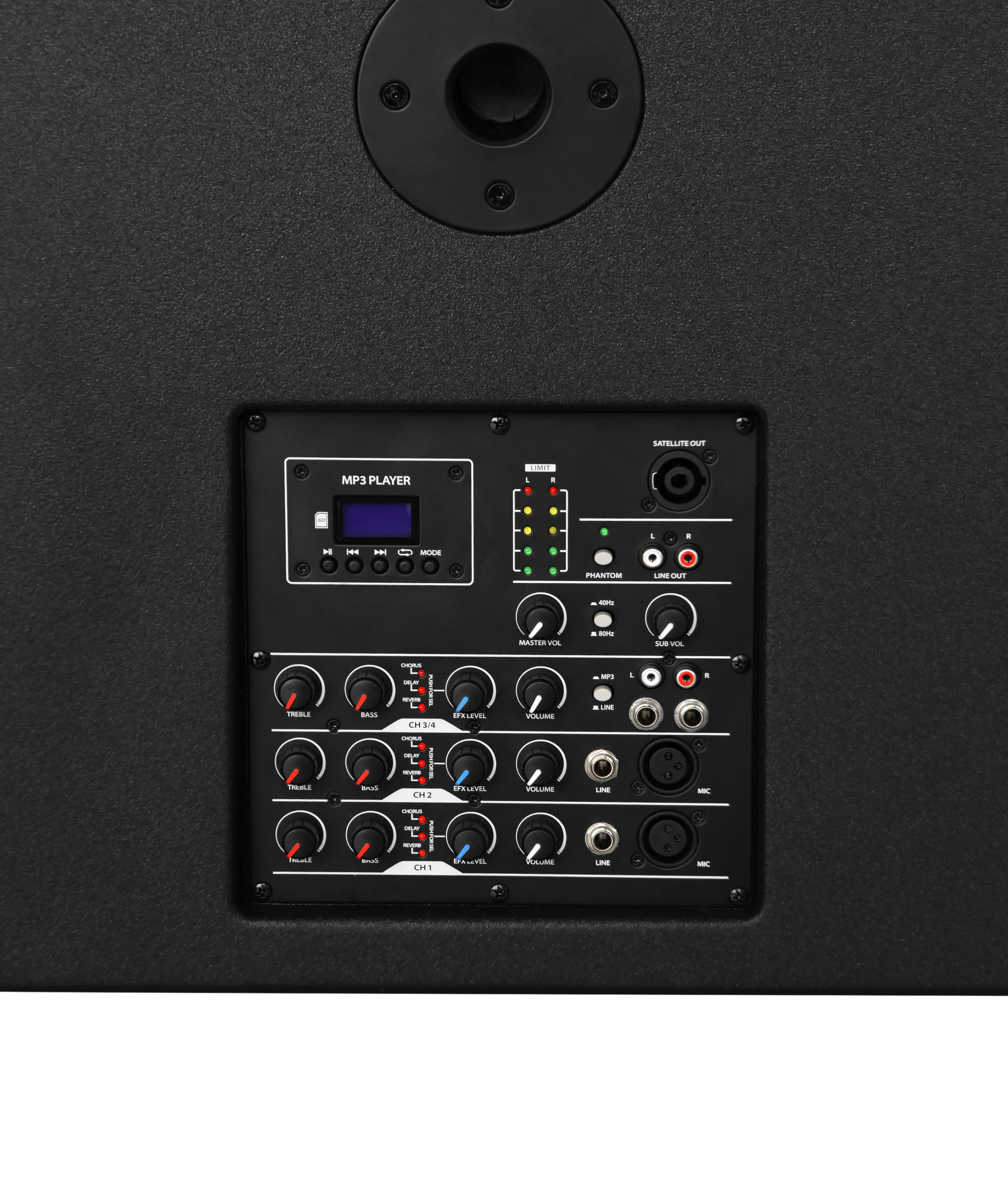 - Canal 3/4: entrada de línea 6.35 mm + entrada MP3 RCA