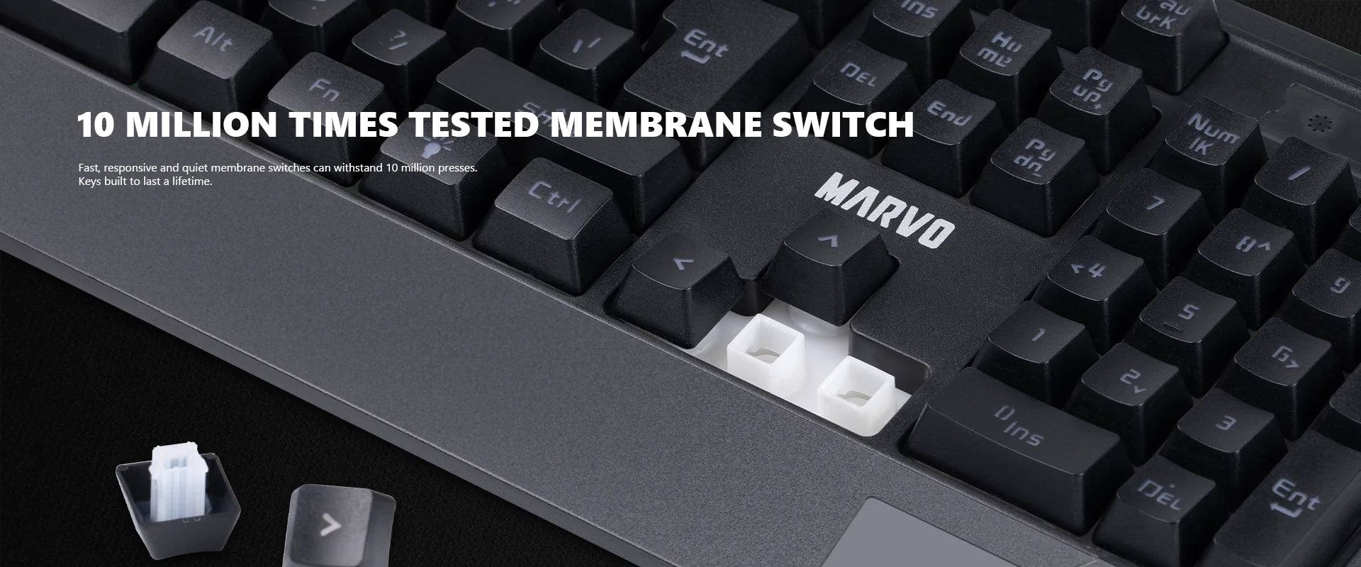 Con sus 104 teclas de tamaño completo, el Marvo K606 proporciona una distribución cómoda y ergonómica que facilita la ejecución rápida de comandos y la escritura fluida. Su tecnología de interruptores de membrana ofrece un tacto suave y silencioso, ideal tanto para juegos como para tareas cotidianas. Cada tecla ha sido probada para resistir hasta 10 millones de pulsaciones, lo que garantiza una vida útil prolongada y un rendimiento estable incluso tras años de uso intensivo. Esta durabilidad se complementa con un diseño robusto que asegura estabilidad y precisión en cada toque, sin importar la intensidad de la acción.