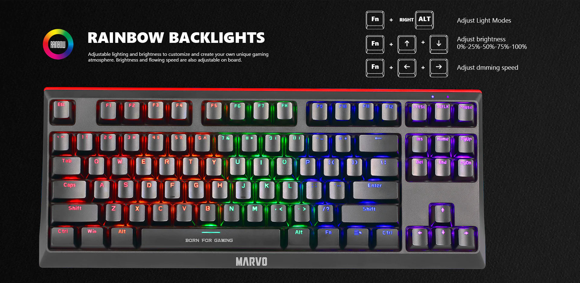 El Marvo KG901 es un teclado mecánico TKL (sin pad numérico) con switches Blue para máxima precisión y retroalimentación táctil. Con iluminación RGB dinámica, está pensado para gamers que necesitan velocidad y personalización en un formato compacto.