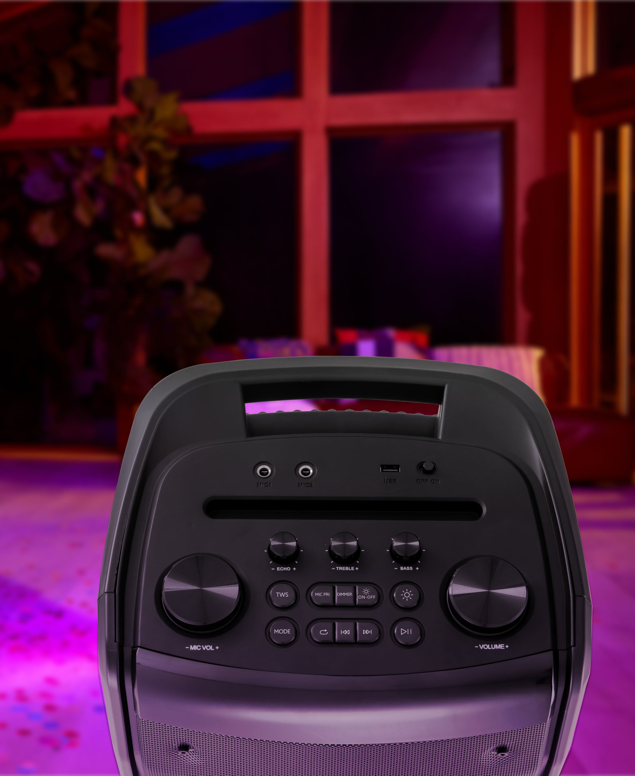 Con placa amplificadora clase D y frente completamente iluminado con luces LED con efectos dinámicos audio-rítmicos y de llamas que se regulan desde el control remoto.